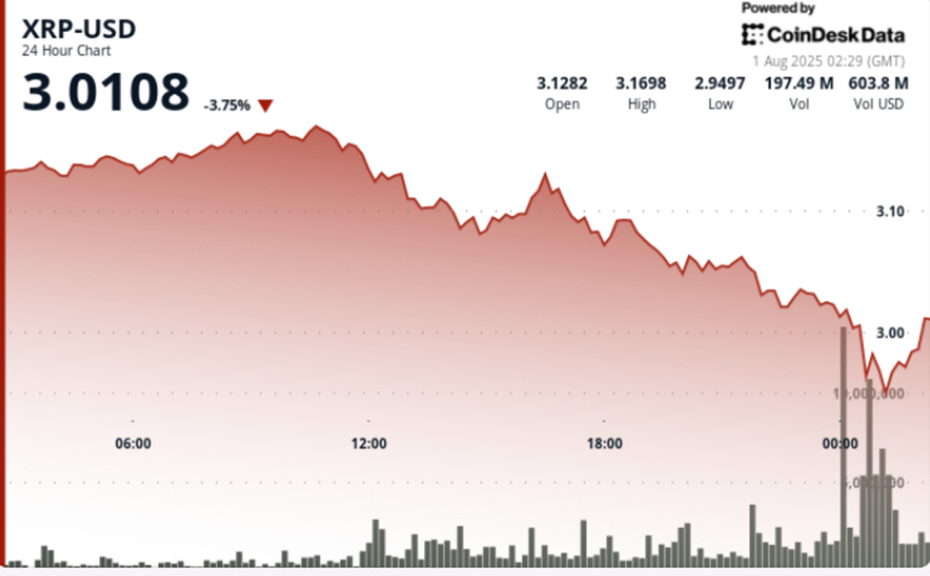 What to Know XRP declined 8% over the past 24 hours, falling from a session high of $3.17 to a