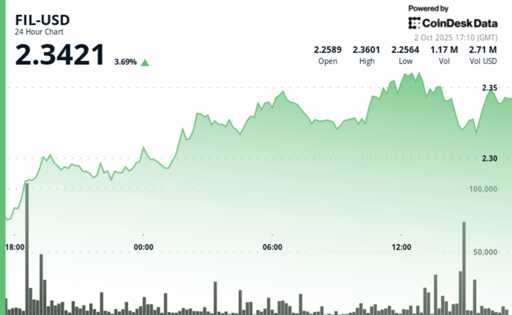 Filecoin (FIL) performed strongly over the last 24 hours with a 4% gain, according to CoinDesk Research’s technical analysis model.